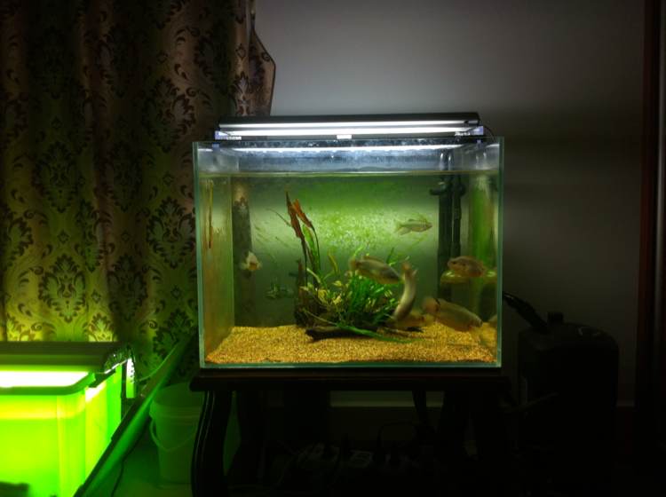 开缸也有几个月了,经过1星期的开强光暴藻,缸壁如愿长一层藻用来做背景[笑眼],鱼的状态看图
