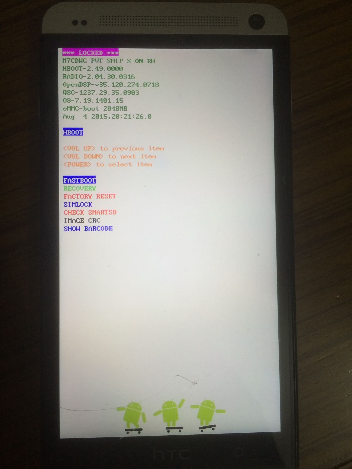 症状:开机卡HTC,然后黑屏,这时需长按方可开机。音量-和电源键可进入hboot,可移动光标,但是按下电源键欲进入下级菜单的时候卡死,只能强制关机。所以recovery进不去。手机未解锁未root。