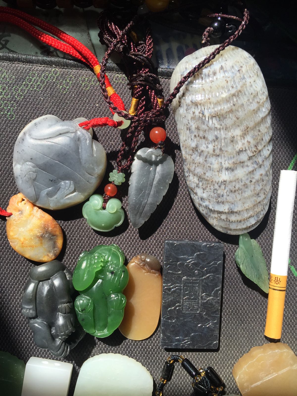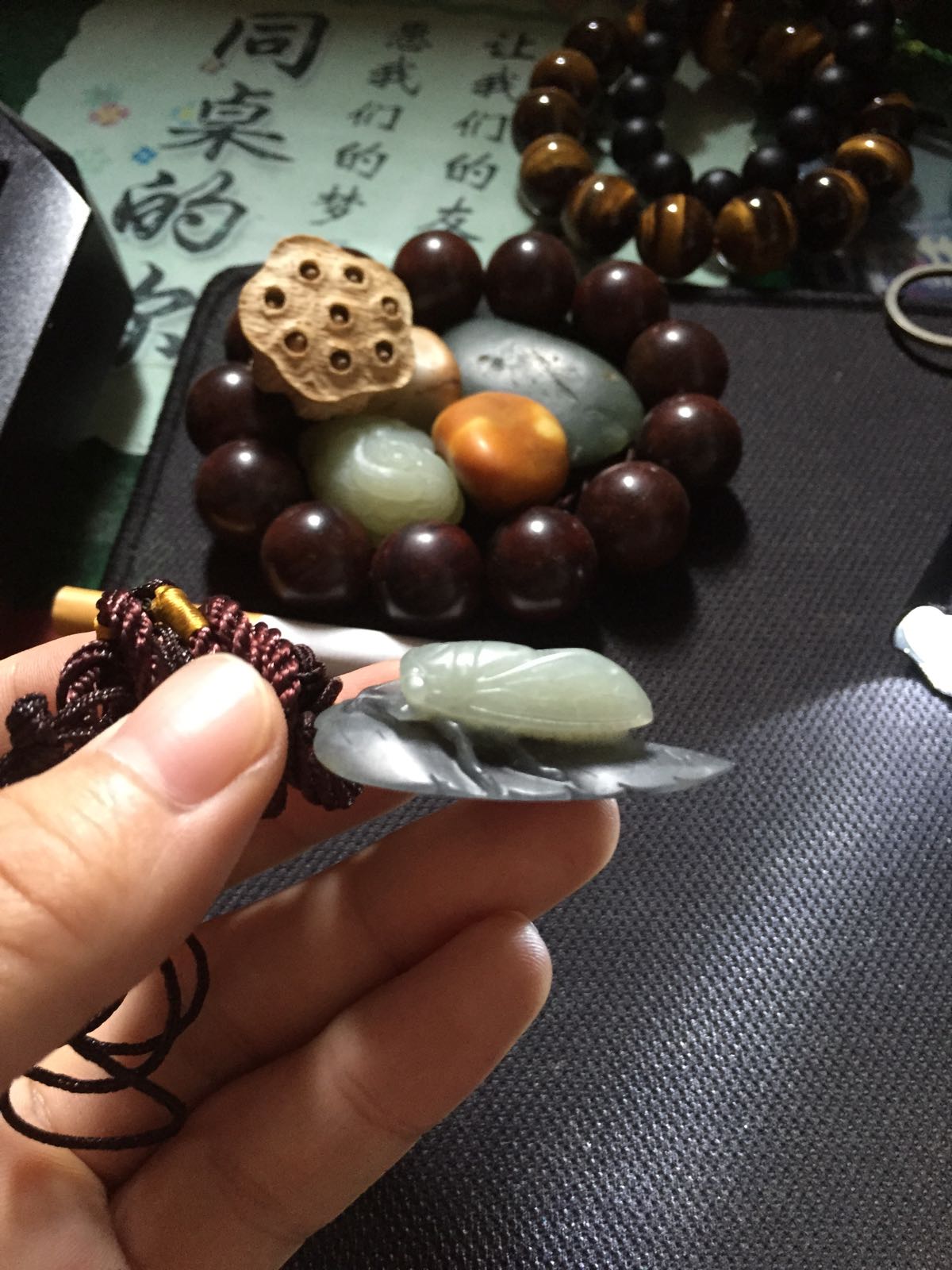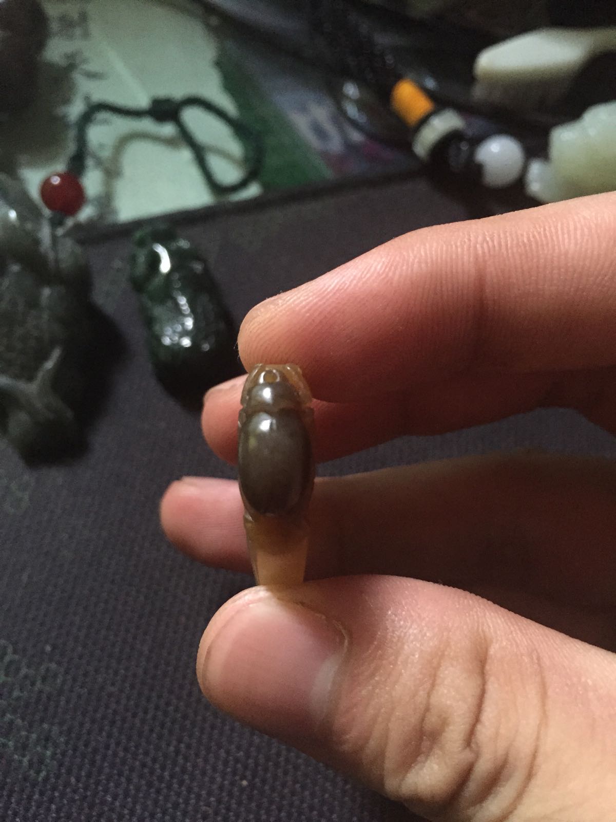 回复 一JIAN风情 :黑牌子有俩,一个祥云无事牌是黑青玉,打灯透绿光,一个关公双面工的青花墨玉,打灯透白光。