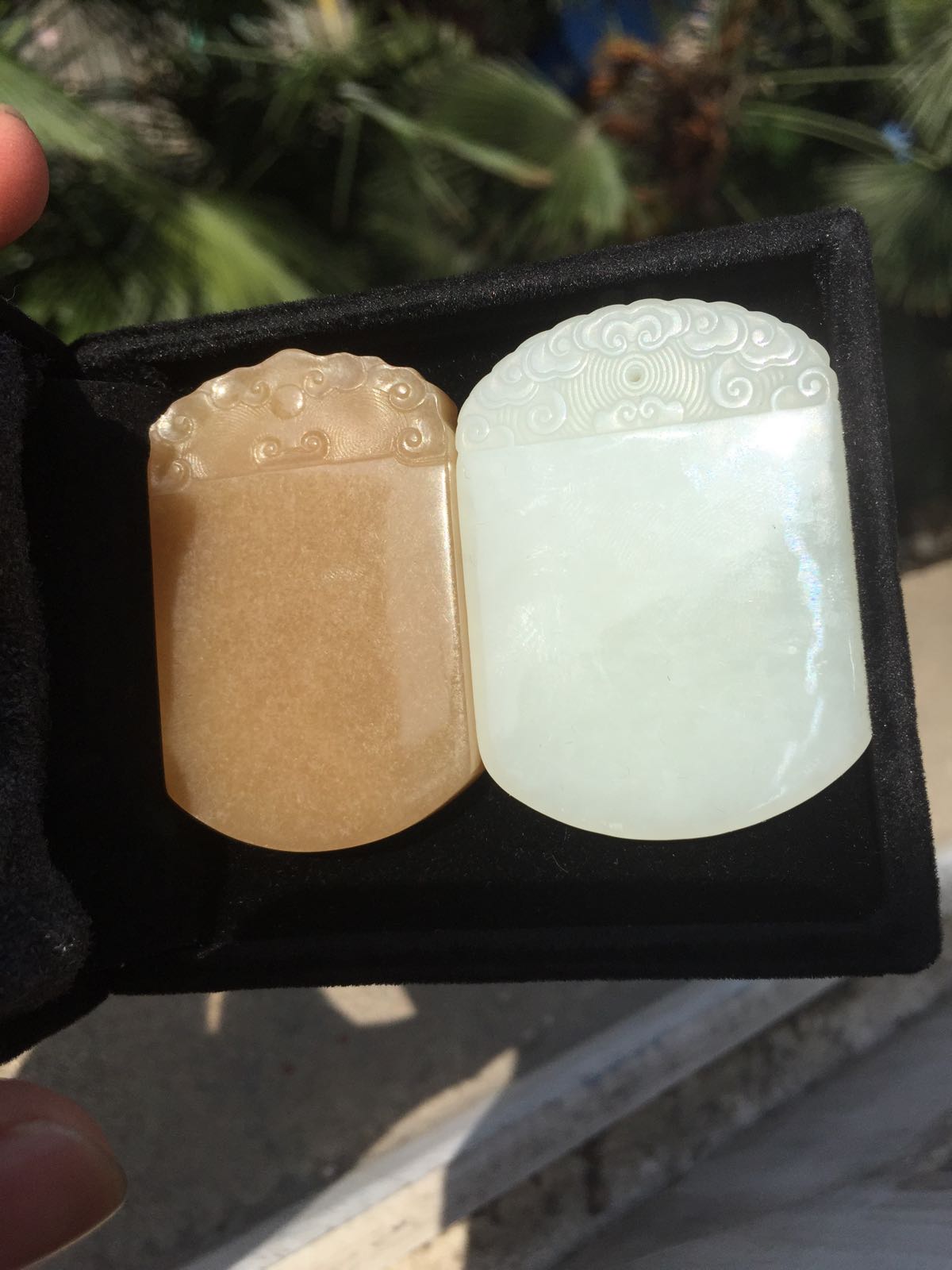 小白方牌是野牛沟高密料,一级白,克价100,17克,1500,牛鼻孔,碧玉牌完美品1200也有普品100,微信Six5exy可以看细节