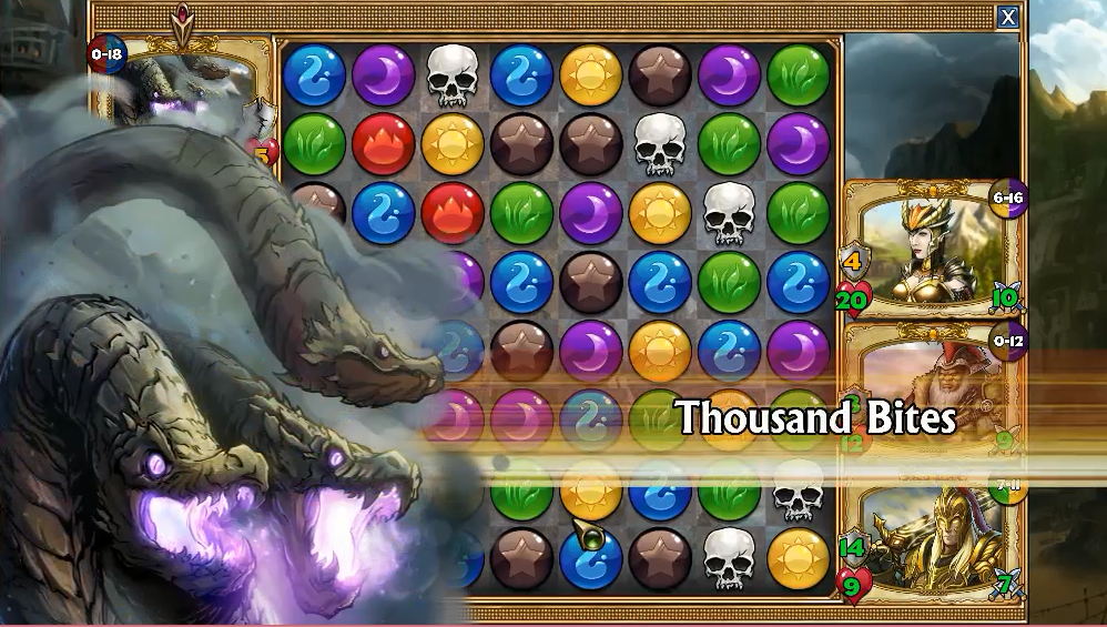 图1:红龙炮已开,敌MT已秒,留下大量骷髅盘。对于普通红龙组合,这简直就是副作用。但是对蛇套来说,绝对是福利!这里至少有3组可控的骷髅输出,考虑18血挡不住10攻2下,期间必定号角一吹。由于左下骷髅三消后的掉落可能形成顶部土珠4连出现危机,这里建议优先消中间偏左的骷髅或直接开号角。