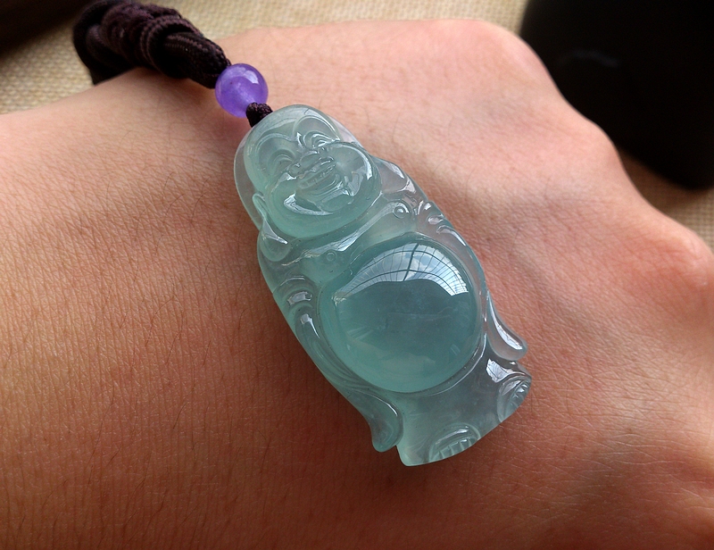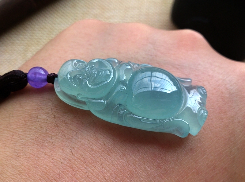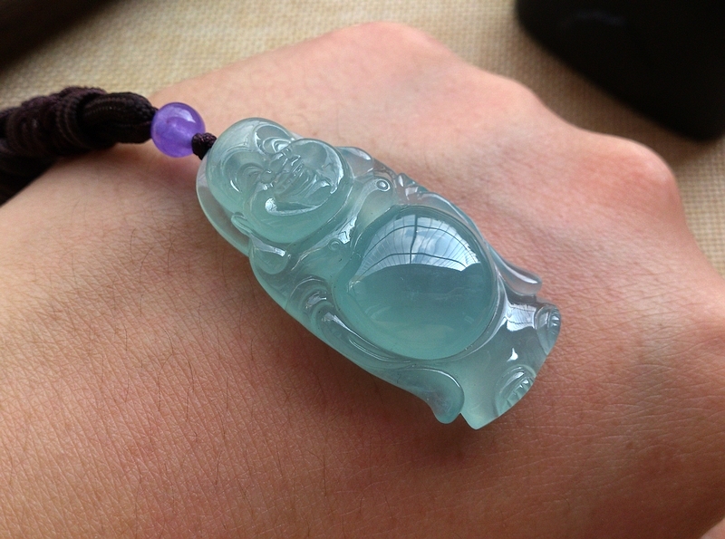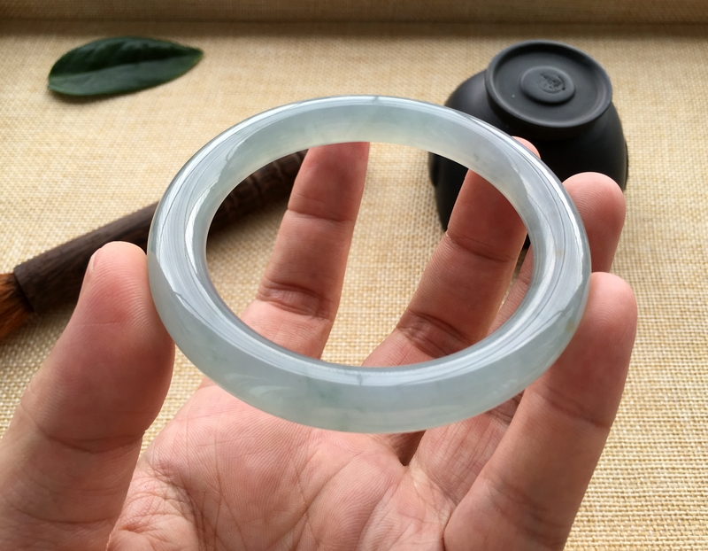 商品及瑕疵情况介绍:A货翡翠,无纹无裂,晴蓝底色,冰化底,底子干净细腻无杂质,正装饱满,用料十足,适合收藏的好料