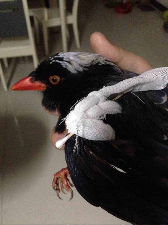 下乡捡到的,翅膀开放性骨折,骨头出来了,估计气枪打的,简单处理了伤口,希望大家多多指教