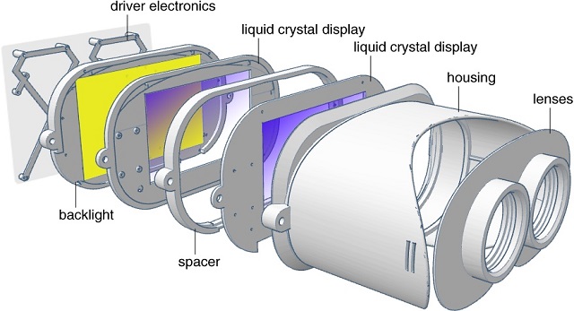 斯坦福大学和英伟达联合发明的这台原型机,其原理是在用户的每只眼睛前面产生景深感,然后结合立体技术,将兼具景深和立体的画面呈现到使用者的眼前。原型机使用了 2 片透明的 LCD 屏幕进行堆叠,从而产生光场效应。画面透过堆叠的 LCD 屏幕后,眼睛就能获得景深的感觉了。它就像在你的每只眼睛前面放置了一副全息图像,能让用户观看到具有深度感的虚拟世界。