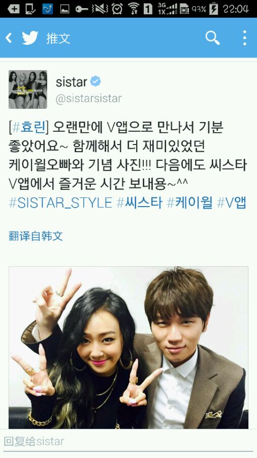 ]好久没在V APP见面了,很开心~和在一起更有趣的K.Will欧巴纪念照~~~下次也常来Sistar的V APP度过快乐时光哦^^(翻译:涵