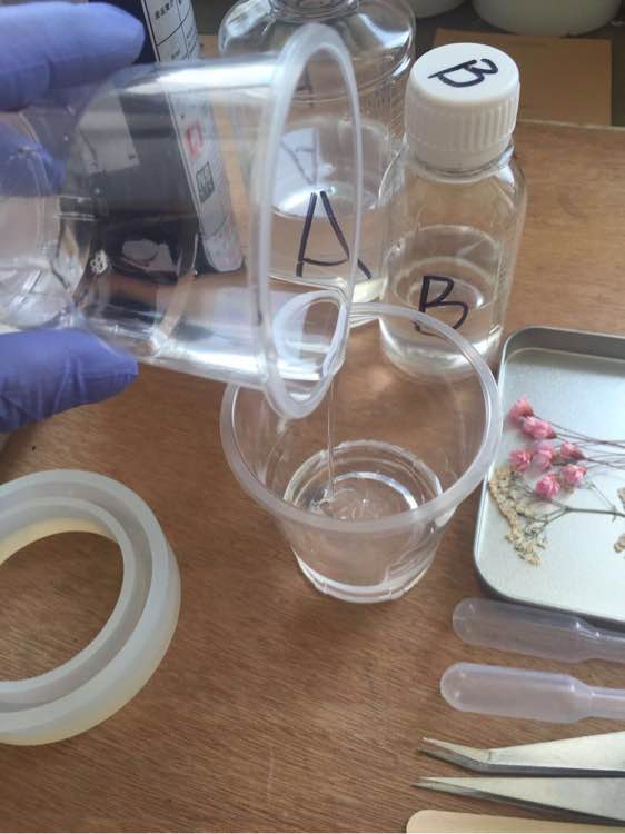 A胶30。B胶10。然后两个搅拌,要搅拌的均匀些,直到有很多小泡泡,小泡泡属于正常现象,静置20分钟后你会发现气泡都会没有,搅拌的时间为10分钟之内最佳