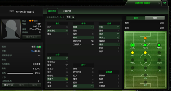 马特乌斯·佩雷拉,这位巴西籍18岁小将,我第一次知道这个球员的那年,他是14岁,因为少时移居葡萄牙,14岁时加入了里斯本竞技青训系统,当时玩fm系列也是经别人推荐才知道有这么一个值得培养的小妖。巴西产出了不少出色的左脚球员,比如里维利诺、杰尔森和阿莱士等等,但是有些遗憾的是,现在我们并没有看到桑巴军团有太多这样的球员。不过,可以在佩雷拉的身上,看到希望。今年6月在西班牙举行的国际U17锦标赛上,佩雷拉被选为赛事的最佳球员。