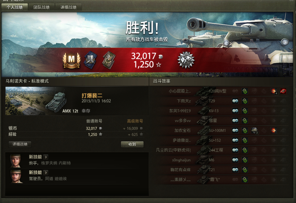 只有女车长有个灯泡,其它人都没技能。。点灯的过程中还亮了几次,只剩100血之后头先后跳了3发100M1得以生还