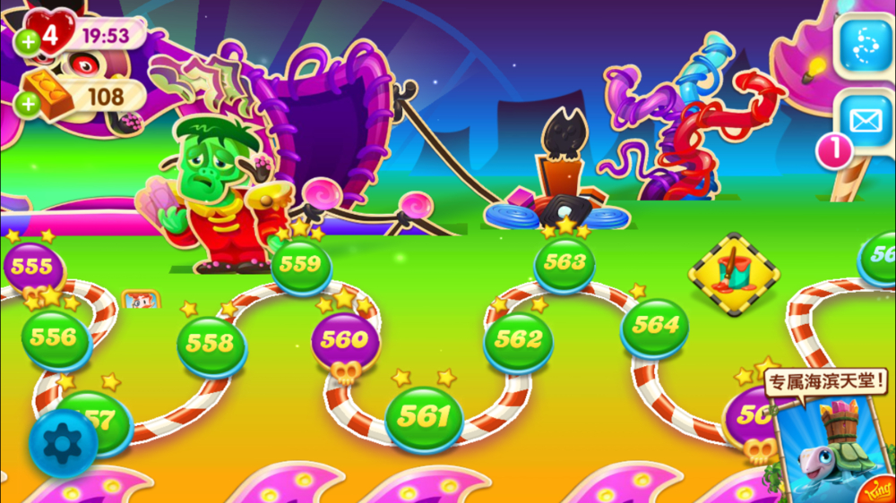 560和565这两个困难关是个冰块的世界,560是涂果酱关,冰块很多,不过好在是4色关卡,容易形成特效。565是运小熊的关卡,冰块超多,虽是个4色关卡,但还有运气成分,我幸运地组成了彩糖和染色糖的组合,之后上面的冰块变为虚无,一下将3个小熊运到了顶部。