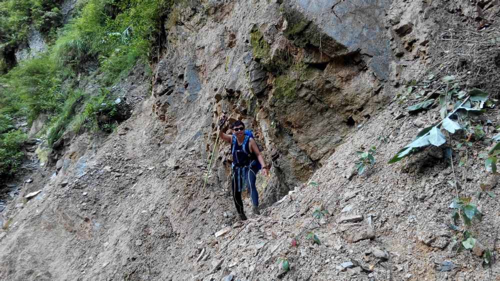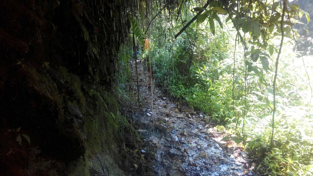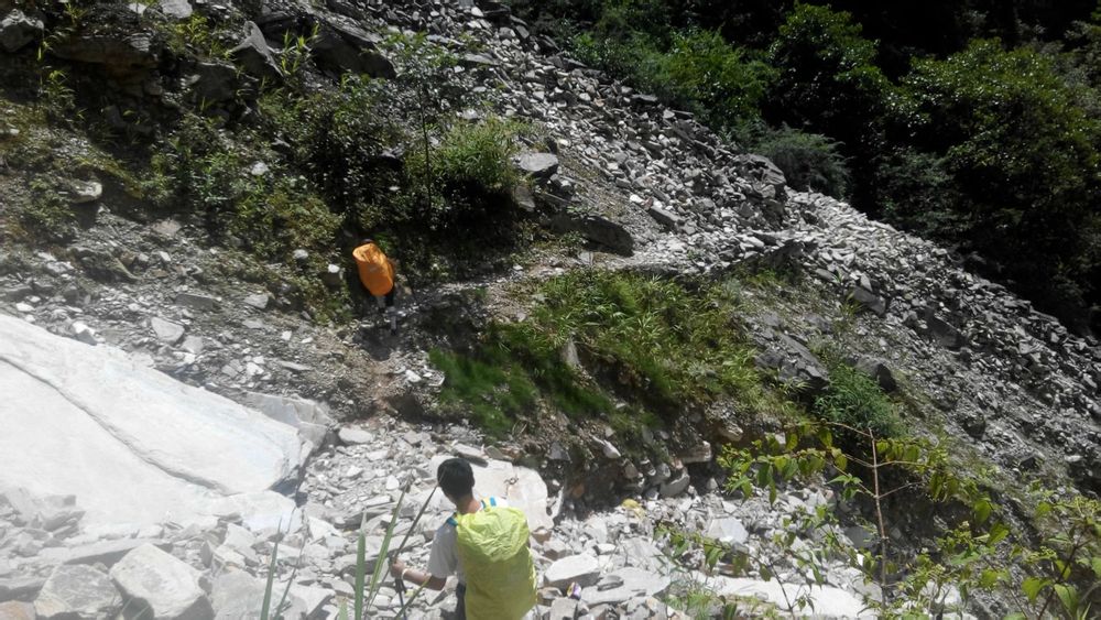 往背崩的路上因为路程比较长,然后随着海拔的下降已经变成了夏天,所以对水的需求会比较多,这里给大家的建议是发现自己开始猛灌水的时候一定要忍住,不要再喝了,因为你只会越喝越渴,可以试试含点有盐份的东西,你会发现有奇效,而我呢比较懒,直接舔一舔嘴巴旁边的汗,呵呵,可能有人会说我乱喷,但是起码我没有说没水喝口渴,水带太多了很重,而且这段路上的山泉可能都虫卵不太安全,建议饮水不要超过1.5升。