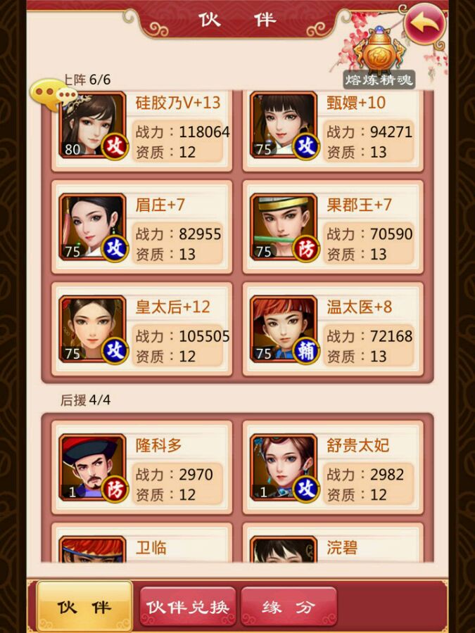 我有点动摇了想放弃果郡王了,13的资质可是属性一点也不好,攻低防低暴击低,那个晕几乎就是鸡肋啊,还不如同配置的资质12的卡,换成太妃好不好?可惜还要重新培养,哎