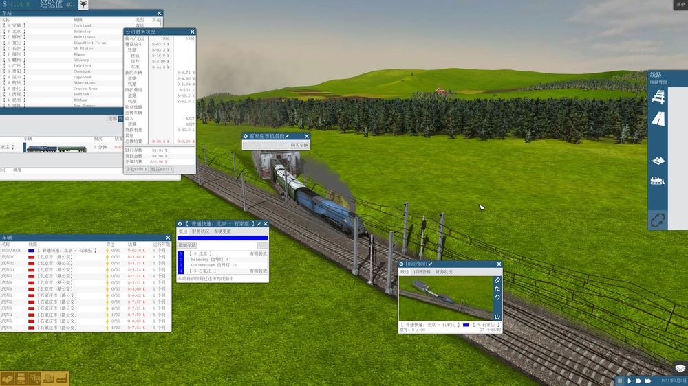 删除零成本建设MOD开始游戏,初始资金仅3M,选择了北京-石家庄线路,贷款购买了两市的公交车,列车选择上,由于1950年电力机车性价比略低,最终选择了A4级高速蒸汽机车牵引5节BC4车厢,最大速度120km/h