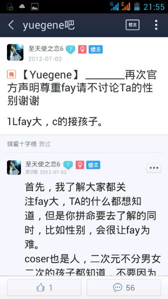 我是新粉,很喜欢fay,喜欢的是ta这个人以及ta的作品。性别什么的没那么重要吧,难道只因为fay不是你所想的那个性别,你就不喜欢fay了吗?我不会,我想真正喜欢fay的人都不会。所以楼楼你真的很赞,你说的话让我更加喜欢总裁了也开始心疼总裁了。因为没有与总裁接触过,所以不知道原来总裁是一个如此好的人。喜欢总裁,从心底里喜欢