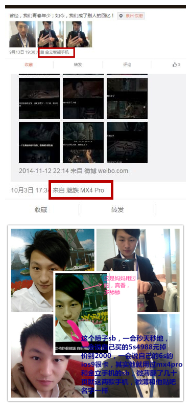 跟他解释硬件和参数区别呢,我一直在解释,他一会给我扯他自己的6s的ios9卡,一会给我扯ios7秒ios9,啥都不懂还乱jb扯.一进他微薄我笑了!看他历史发言还发过:他4988买了5s一年了,现在降价到2000多在那吐槽了。其实进他微薄一看,之前一直用的金立手机,后来应该是在贴吧买了个二手4pro。他贴吧发言历史里有很多别人二手出售4pro的帖子他都进去搞价了