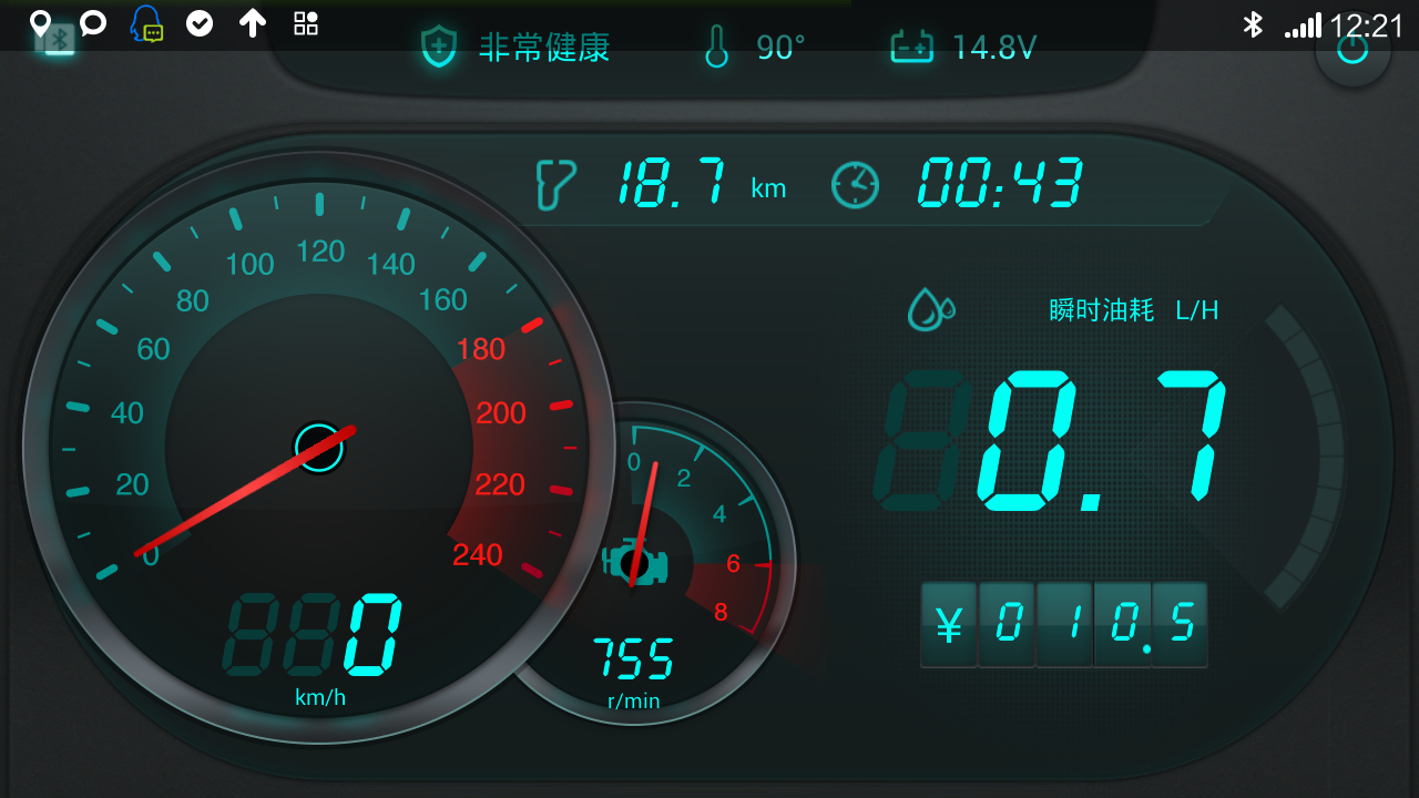 通过蓝牙传输到手机上 手机上装一个app 可以显示仪表 瞬时油耗 温度 电压等信息 开车看仪表不用低头了 手机放方向盘前面的台子上