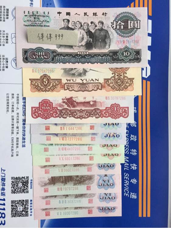【大团结10元,炼钢5元,拖拉机1元,凸版水印5角,平板5角,三罗2角,二罗2角,红二凸1角,红二平1角,蓝三1角,蓝二1角,1分,2分,5分,】