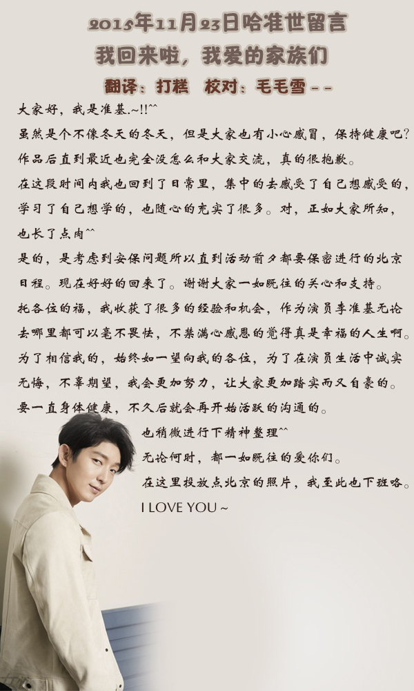【翻译】╬15.11.23╬哈准世长篇留言:我回来啦,我爱的家族们