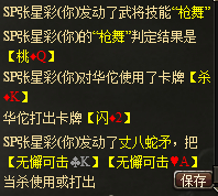 ②、星彩判定枪舞结果桃Q,先使用杀K,再使用丈八拍无懈K和无懈A,之后不能出杀了。附图: