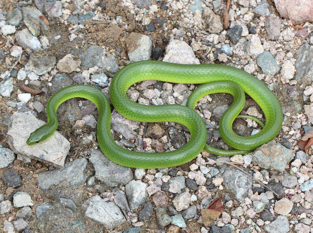 这条翠青蛇遇到的比较偶然,当时开车去山里玩,本来一条蛇也没发现,于是打道回府,不过刚开车没多久就突然看到一条蛇横在前面的山路上,于是急忙猛踩刹车,下车查看长舒一口气,差一点就把它压到。
