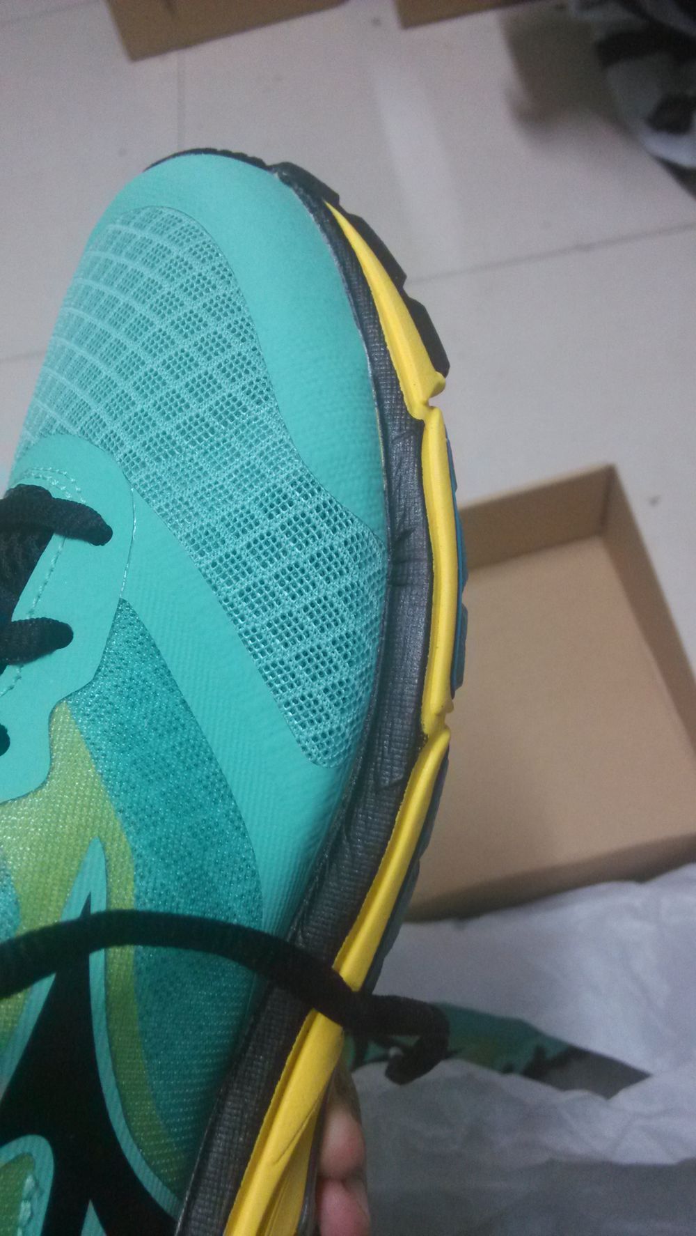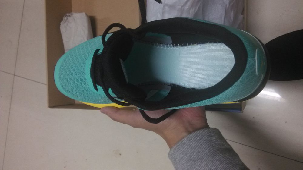 刚开始看到那圈黑的感觉像是染上去的,感觉做工很粗糙,还有前掌感觉太宽了,两侧缓震都突出来了,和我想象中的完全不一样,感觉好丑。后来看了亚马逊上的图片才知道这款鞋确实就是这个样子。