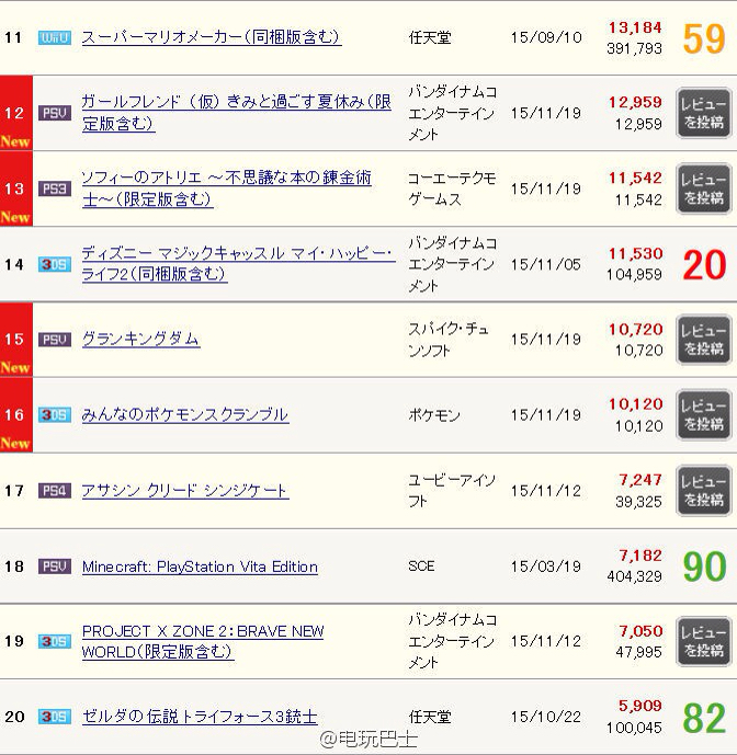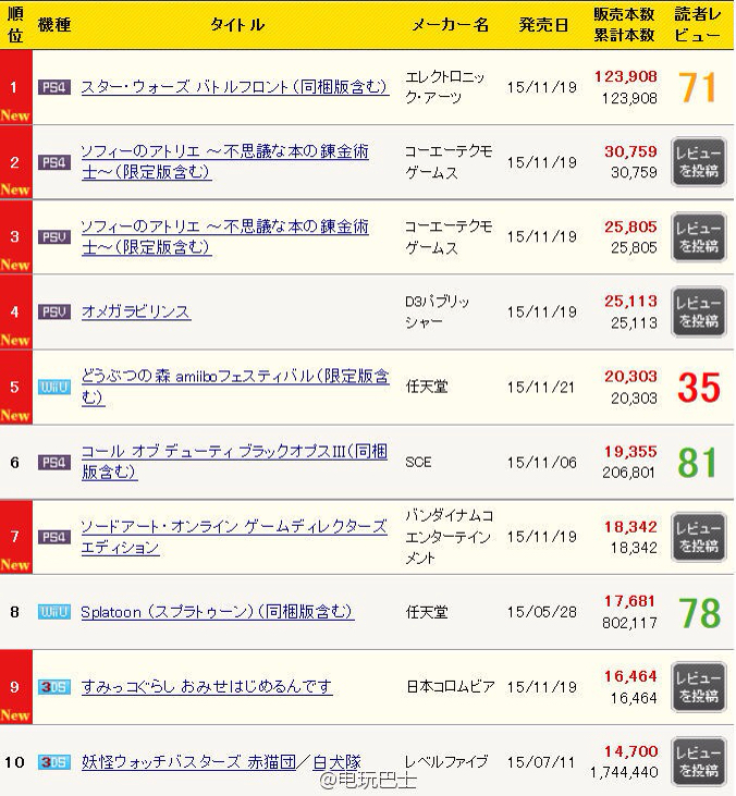 日本MC销量,这周上榜新作非常多,最终PS4《星球大战 战争前线》以12.3万份高居榜首,《索菲的工作室》三版本合计约6.7万份,PSV原创新作《欧米伽迷宫》2.5万份还算不错,WiiU《动物之森 amiibo祭典》2万份排在第五。