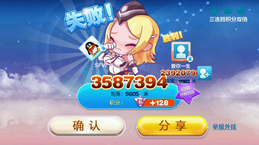由于感受到对手的强大,手抖的3000米就挂了,依然惨败,意外的是对手分数竟然2000W,这系统匹配。。