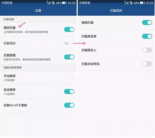 设置中,首先是骚扰拦截功能的开关,下面是拦截规则以及相关数据库的更新设置。