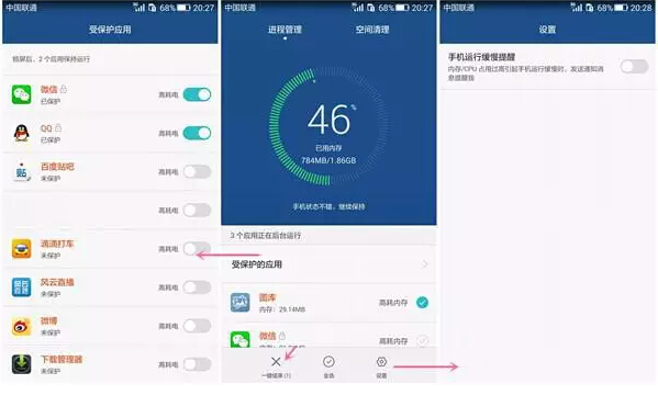 进程管理:显示当前占用内存应用的数量和列表,能够全选或者单选进行清除;对于常用的应用如果不希望被一键清除,可以添加到受保护名单中。