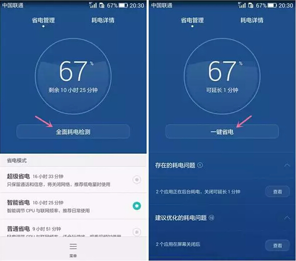 省电管理中,提供了全面耗电检测并可以一键省电优化的功能,同时在检测中可以看到存在的相关耗电问题。省电模式有三种选择,附带文字说明简明扼要,日常使用推荐智能省电。