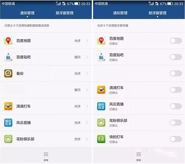 管理应用发送通知,拦截广告;悬浮窗管理,对应用的悬浮窗显示或禁止显示进行管理,让用户的桌面不被各种悬浮窗所干扰。