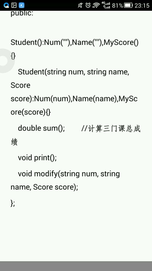 在主函数中,先定义一个学生类对象数组,再通过for循环给对象数组赋上实际值,最后输出对象数组个元素的值。class Score{protected: double Chinese,English,Mathematics; public: Score():Chinese(0),English(0),Mathematics(0){} Score(int Chinese, int English, int Mathematics):Chinese(Chinese),English(English),Mathematics(Mathematics){} double sum(); //计算三门课总成绩 void print(); //输出三门课成绩和总成绩 void modify(int Chinese, int English, int Mathematics); //修改三门课成绩 };class Student{protected: string Num, Name; Score MyScore;//学生类中包含Score类的对象,体现了组合,让学生重点掌握public: Student():Num(""),Name(""),MyScore(){} Student(string num, string name, Score score):Num(num),Name(name),MyScore(score){} double sum(); //计算三门课总成绩 void print(); void modify(string num, string name, Score score);