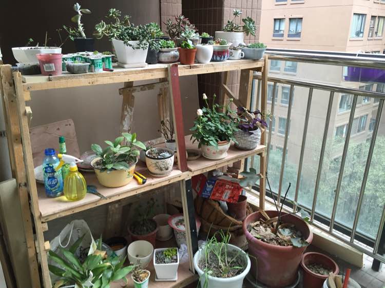 阳台全景来了,楼主家阳台很小,空调外机还不准我挂外面,哎~不过我刚买了一个小花架,准备把阳台塞满