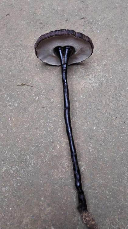家人在村里山脚一个树桩采到的野生紫芝,昨天才发图片给我,我看到的时候也是惊呆了,菌盖直径10cm,根全长居然28cm,据说采的时候周围还有几朵树舌,但是没有拍照,我也没听明白那是什么树长的,据说那种树可以榨油什么的