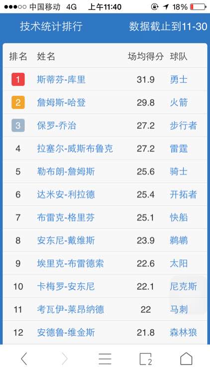 出场次数达到球队总场次百分之70才能进去排行榜