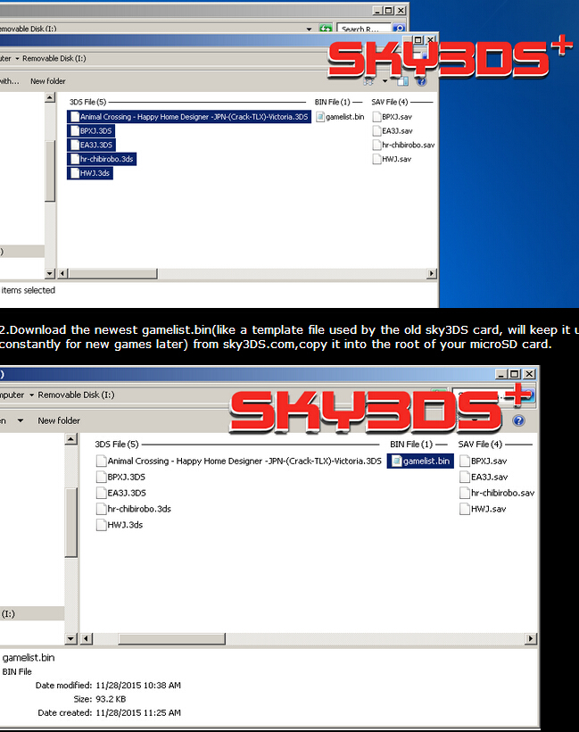2.Download the newest gamelist.bin(like a template file used by the old sky3DS card, will keep it updated