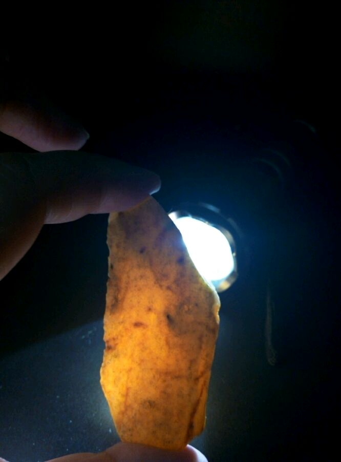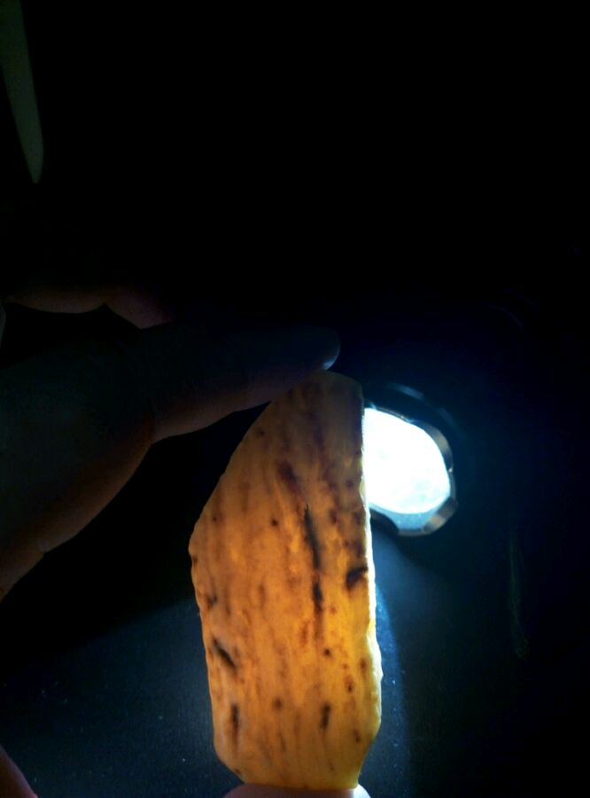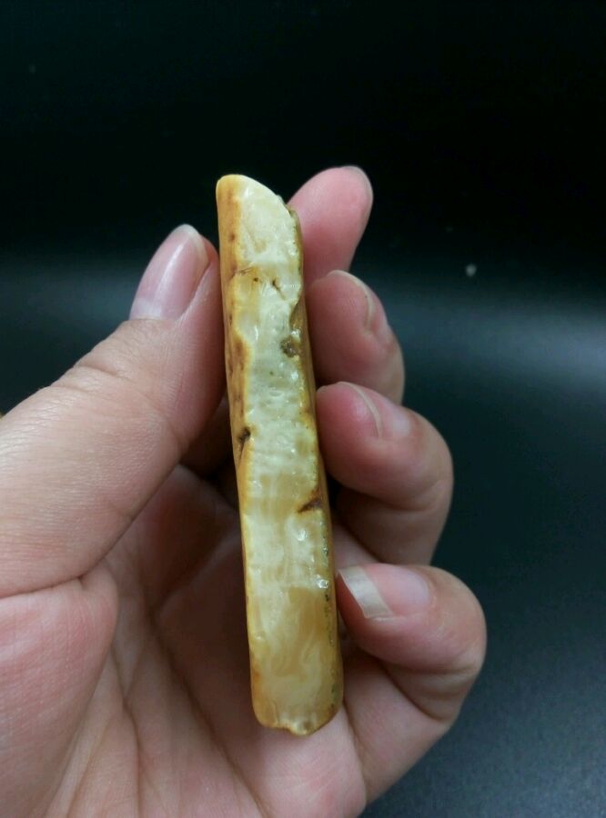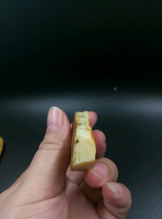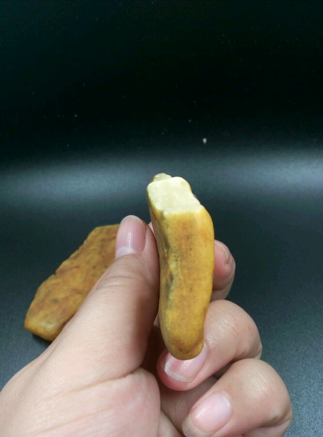 带点奶白奶白的样子,仔细看里面的云纹也挺好看的,两块均打灯看不出有杂裂,大的那块背面皮子有杂沁,但只在皮子表皮,并没有沁入肉肉里。