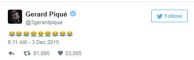 在皇马的比赛下半场开始没多久时,皮克在推特上连发了9个表情,其中先是3个破涕为笑的表情,再是3个大哭的表情,最后又回到了破涕为笑。西媒和英媒都将这些表情解读成了皮克在嘲笑皇马。