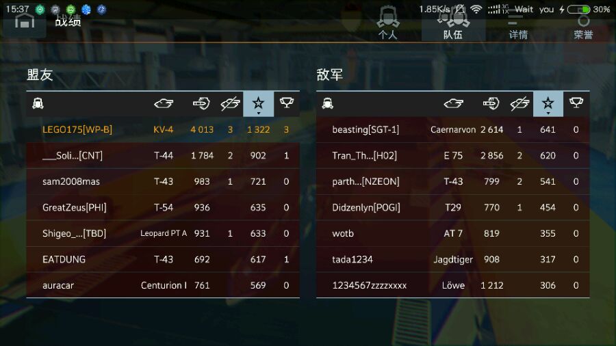 白班kv4首胜,队友全死了,对面75有600血,狮子满血,43有385血。我就600血,被75打穿一炮久22血了。