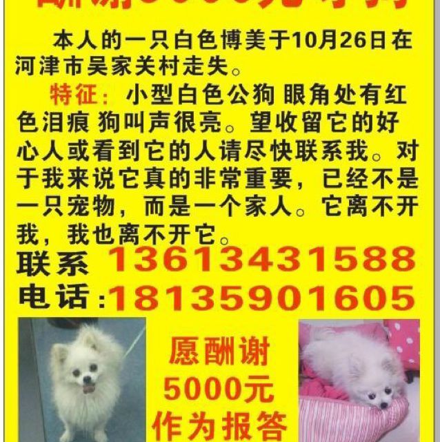 只望消息得到扩散 只望各位遇到朋友可以好心的告知一句 河津贴吧有人找博美。 找不到它我心不甘。谢谢谢谢谢谢谢谢谢谢谢谢