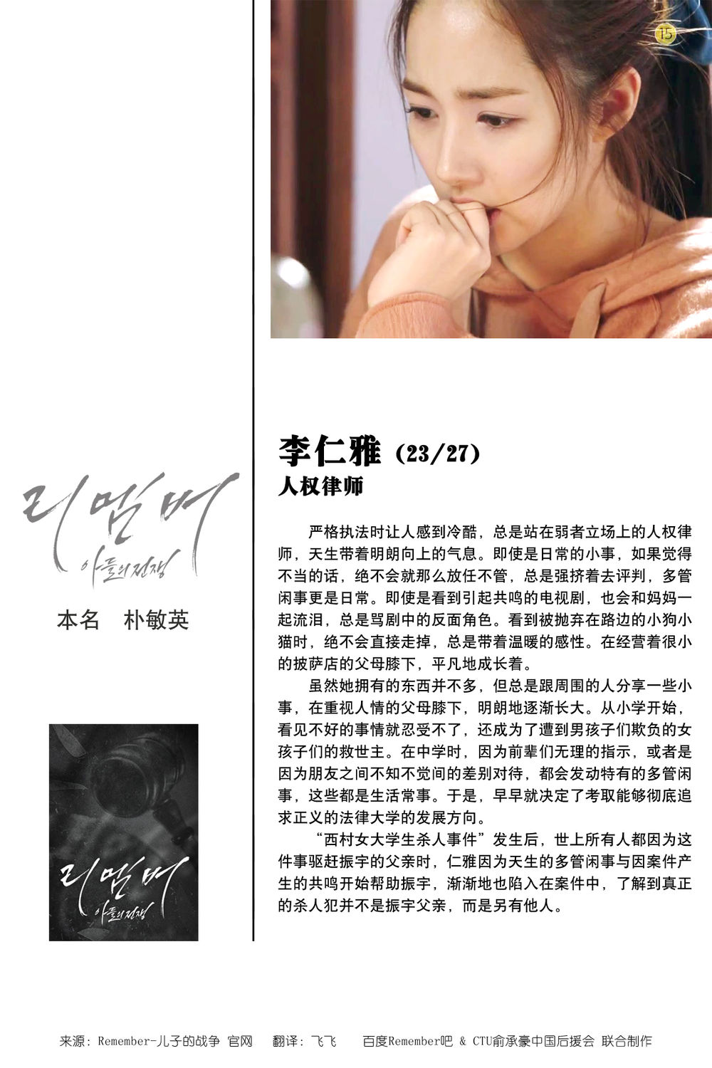 严格执法时让人感到冷酷,总是站在弱者立场的人权律师,天生带着明朗向上的气息。即使是日常的小事,如果觉得不当的话,绝不会就那么放任不管,总是强挤着去评判,多管闲事更是日常。即使是看到引起共鸣的电视剧,也会和妈妈一起流泪,总是骂剧中的反面角色。看到被抛弃在路边的小狗小猫时,绝不会直接走掉,总是带着温暖的感性。在经营着很小的披萨店的父母膝下,平凡地成长着。