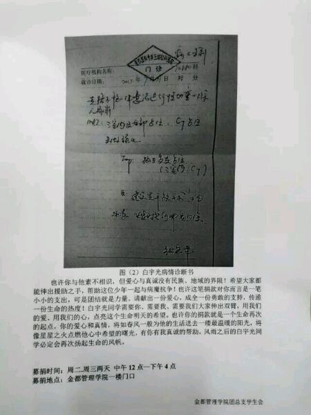 这是我一个老乡同学,一个高瘦高瘦白白的男生,老乡聚餐的时候一起吃过饭,偶尔还会打个招呼,看起来虽然腼腆但是是一个很热情、率真的大男孩。(看到的转一下/玫瑰/玫瑰/玫瑰)金都电商1412班的,曾也是校模特队的一员。现在得了重病躺在医院,是恶性肿瘤引发的脑积水,已经花了30多万了,生活不能自理需要特殊照顾。病魔无情,人有情,本周二周三金都一楼有募捐,希望大家尽一份绵薄之力,帮帮忙,在这个最美好的年纪,希望他可以挺下去,快点好起来,我们与他同在/爱心/爱心/爱心/爱心