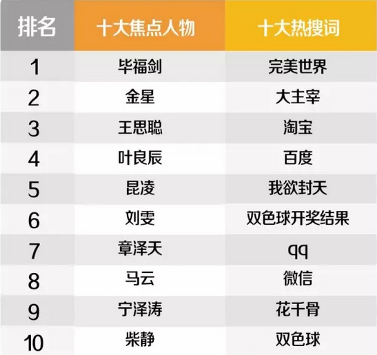 2015年度十大焦点人物及热搜词,人物只知道5个,至于热搜词,竟然没想到会有完美世界,大主宰,我欲封仙,而且,完美世界排在了第一