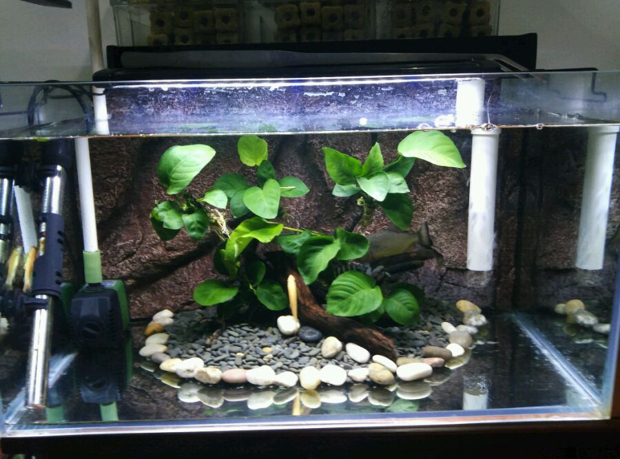 这么布景,养黄钻合适不,才买的红腮黄钻。昨晚才回家,还躲着呢