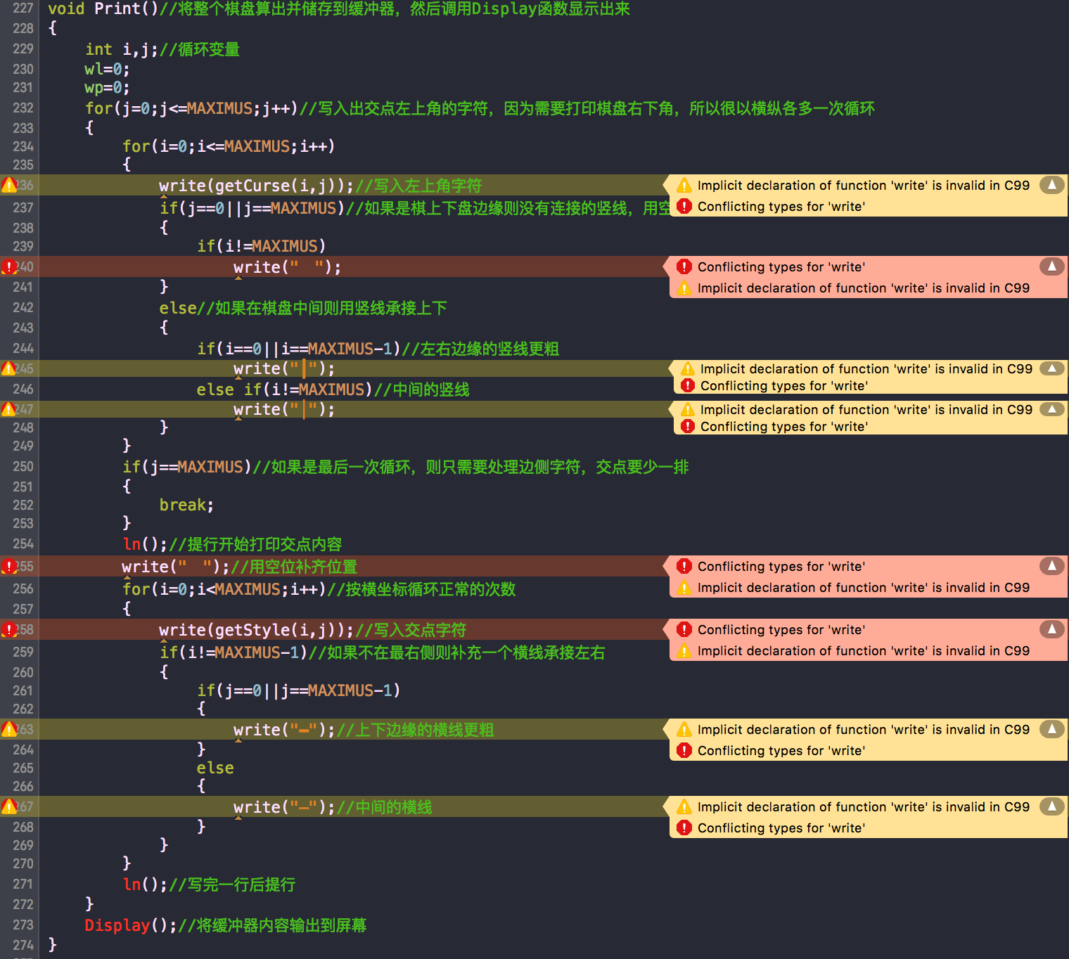 这是我找到的用c语言编写的五子棋源代码,但是我复制到Xcode中,将未发现的头文件conio.h注释掉,并将getch改为getchar。报错显示write函数有问题,接下来使用了write函数的另一个函数大量报错(如下图)。求指点!