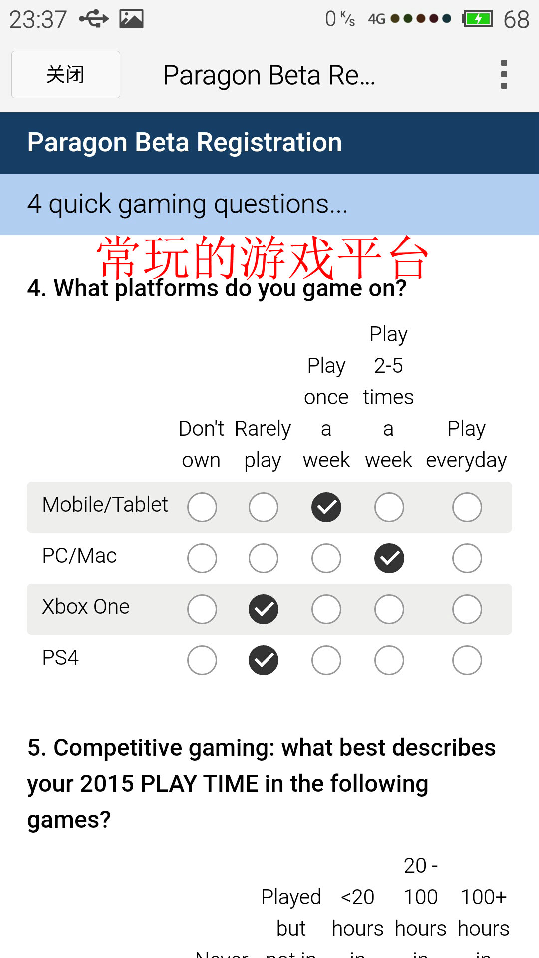 第五题:大概意思是问,你在2015年中,玩以下游戏的时间大概是多少。
