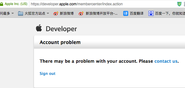 然后登陆苹果的开发者网站账户,出现提示信息"There may be a problem with your account. Please contact us.", 有没有遇到同种情况的,还是我的账户问题.....