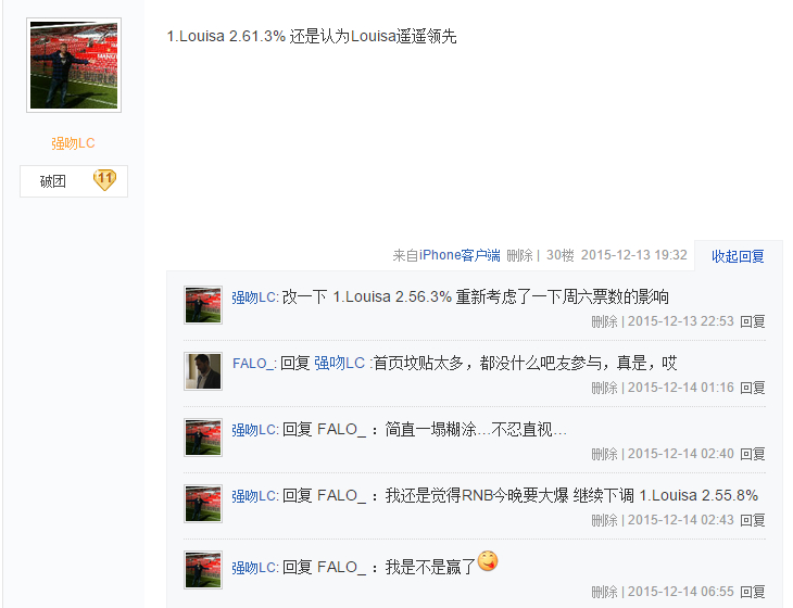第6周结束,强吻有2分的优势,加上两人都预测Louisa夺冠,冠军就是两位大神的争夺了