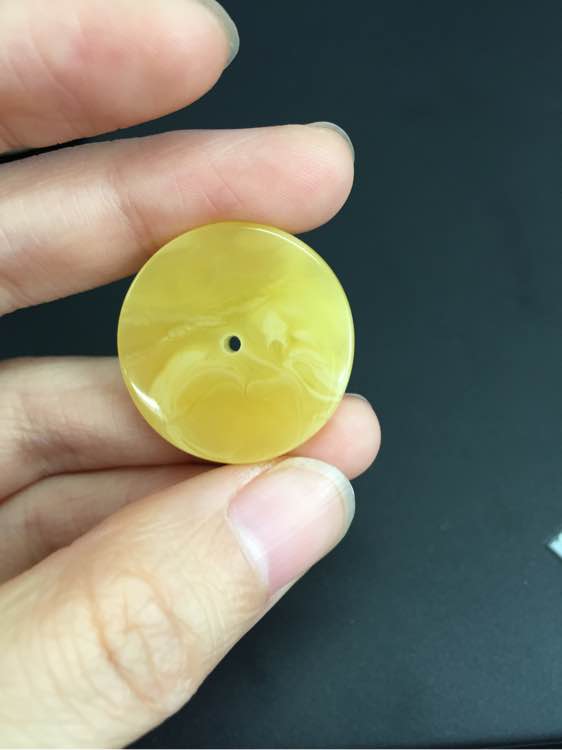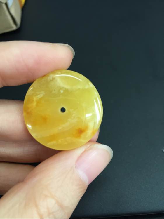 蜜蜡平安扣,一面带白色的云纹,一面带点皮,挺大但是有一边比较薄,大概2.74克25mm,bh180