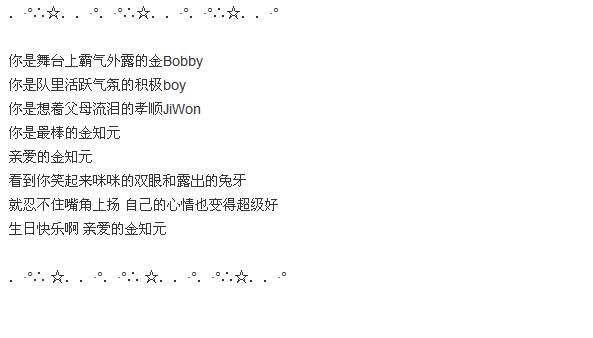 ◤◤☼☼☼╭—╮☆╰百度iKON金三角吧邀您共庆╯☆╭—╮☼☼☼◥◥♤♤....***....♤♤....♤♤12月21日Bobby金知元生日♤♤....♤♤....**....♤♤◣•▁•⊹•▁•⊹•▁•⊹送来12月25日&1月1日双旦祝福⊹•▁•⊹•▁•⊹•▁•◢