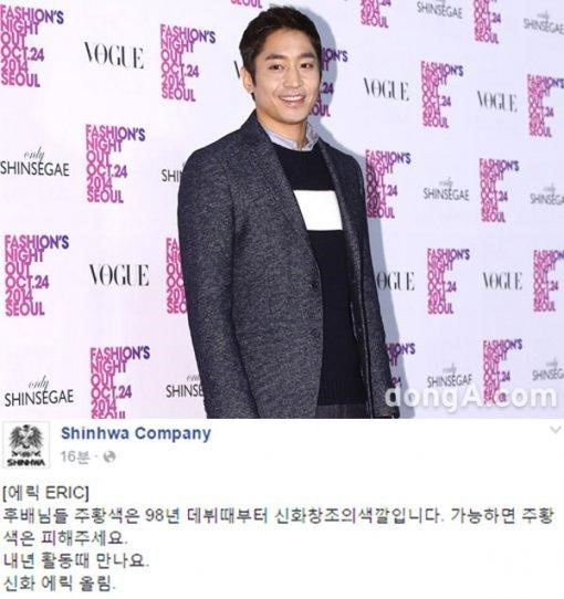 Eric于18日下午通过经纪公司Shinhwa Company官方SNS账号上传文字“后辈们,橙色自98年出道以来就是神话创造的颜色。可以的话请避开橙色。明年活动见。神话ERIC敬上。”